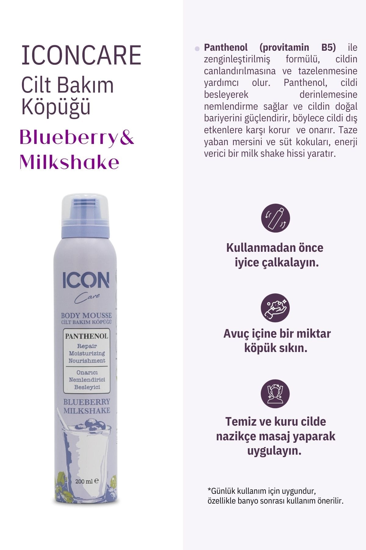 Panthenol (provitamin B5) ile zenginleştirilmiş formülü, cildin canlandırılmasına ve tazelenmesine yardımcı olur. Panthenol, cildi besleyerek derinlemesine nemlendirme sağlar ve cildin doğal bariyerini güçlendirir, böylece cildi dış etkenlere karşı korur ve onarır. Taze yaban mersini ve süt kokuları, enerji verici bir milk shake hissi yaratır. *Günlük kullanım için uygundur, özellikle banyo sonrası kullanım önerilir.